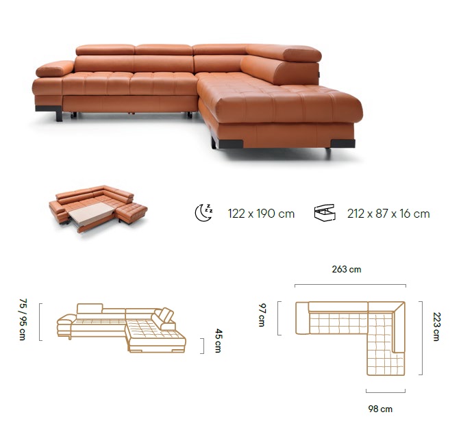 Rozmer: 263 x 223 cm, Výška: 75 / 95 cm, Výška sedu: 45 cm, Spacia plocha: 190 x 122 cm