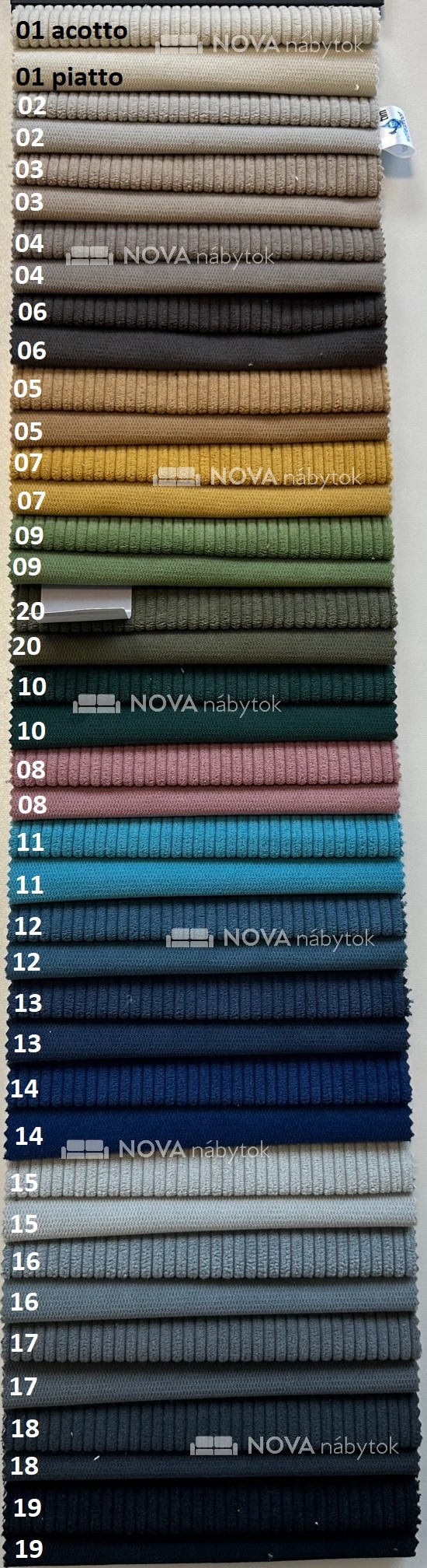 Farebný vzorkovník ACOTTO PIATTO ponúka bohatý výber odtieňov: Neutrálne tóny (01 béžová Acotto, 01 béžová Piatto, 02 svetlosivá, 03 béžovosivá, 04 sivohnedá, 05 hnedá, 06 tmavohnedá), živé akcenty (07 horčicová, 08 ružová, 09 zelená, 10 tmavozelená, 11 tyrkysová, 12 modrá, 13 tmavomodrá, 14 námornícka modrá), odtiene sivej a čiernej (15 svetlosivá, 16 sivá, 17 tmavosivá, 18 antracit, 19 čierna), prírodné zelené tóny (20 olivová) – vhodné do interiérov v prírodnom alebo škandinávskom štýle.