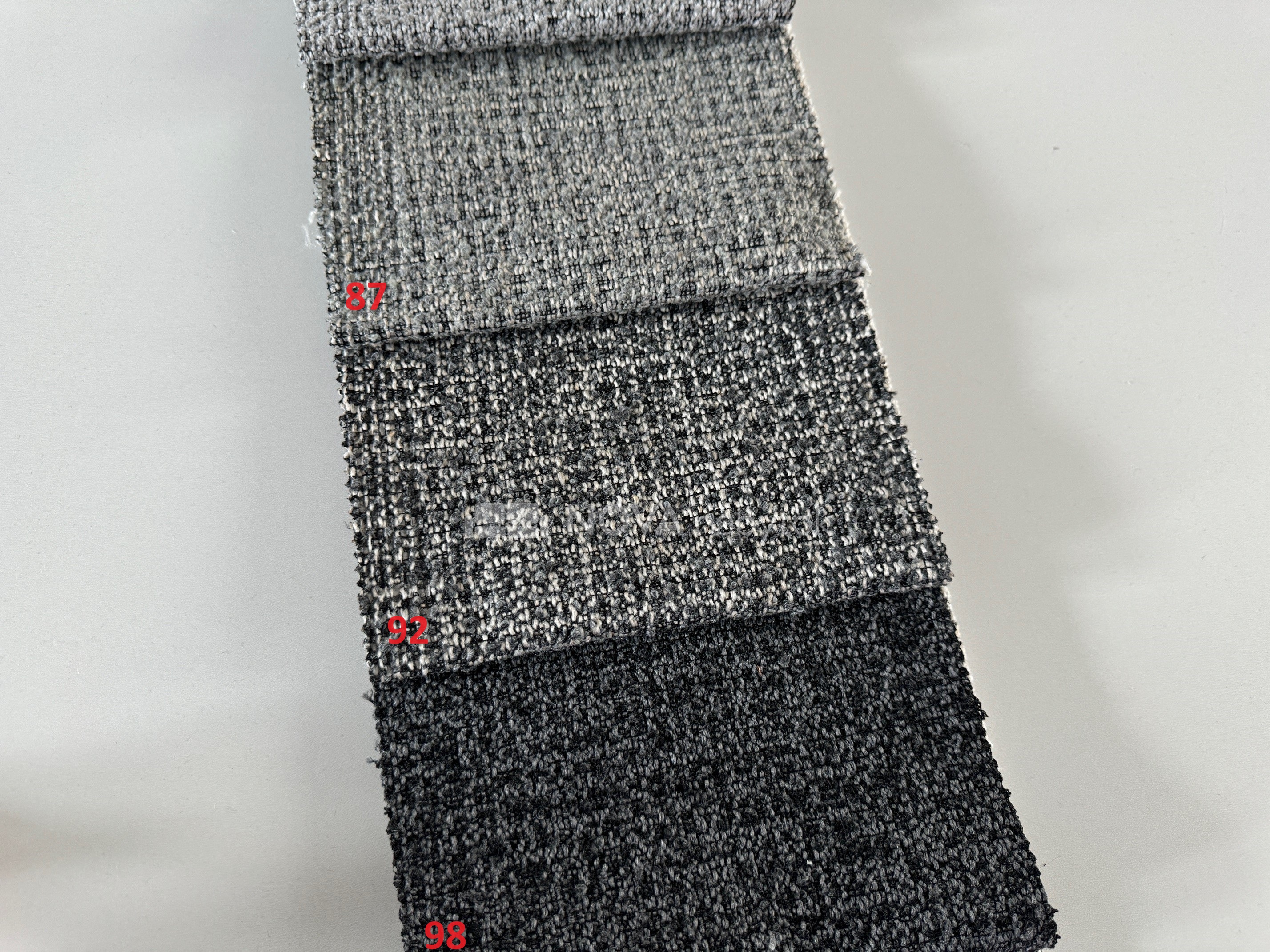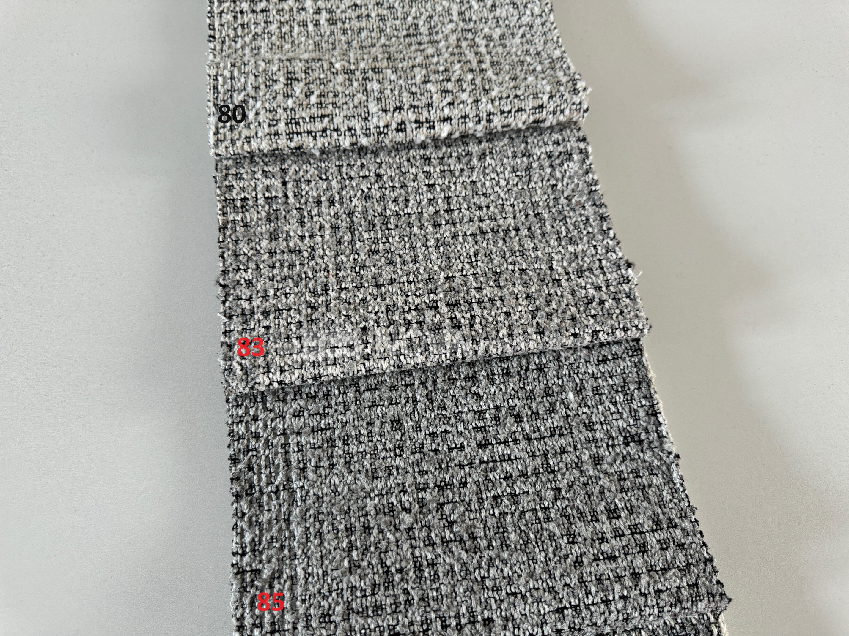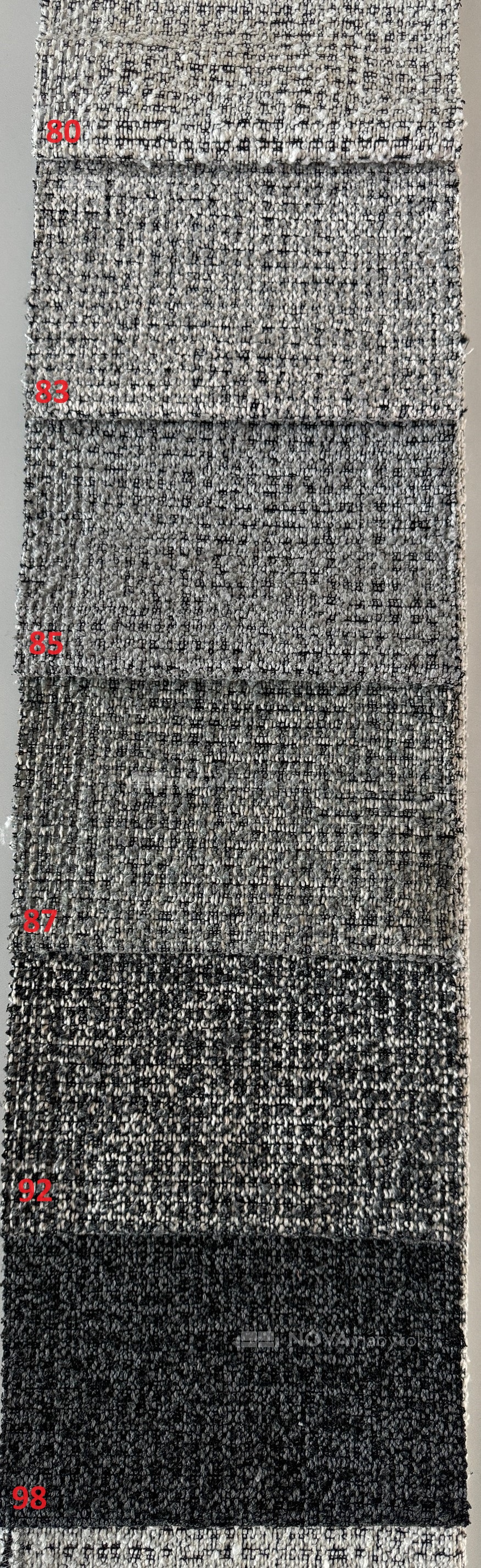 Vzorkovník COCO ponúka moderné odtiene v škále šedej – od svetlej 80 svetlosivá, cez stredné tóny (82 sivá, 85 perleťovo sivá, 87 oceľová sivá), až po tmavšie farby ako 92 tmavosivá a elegantná 98 čierna.