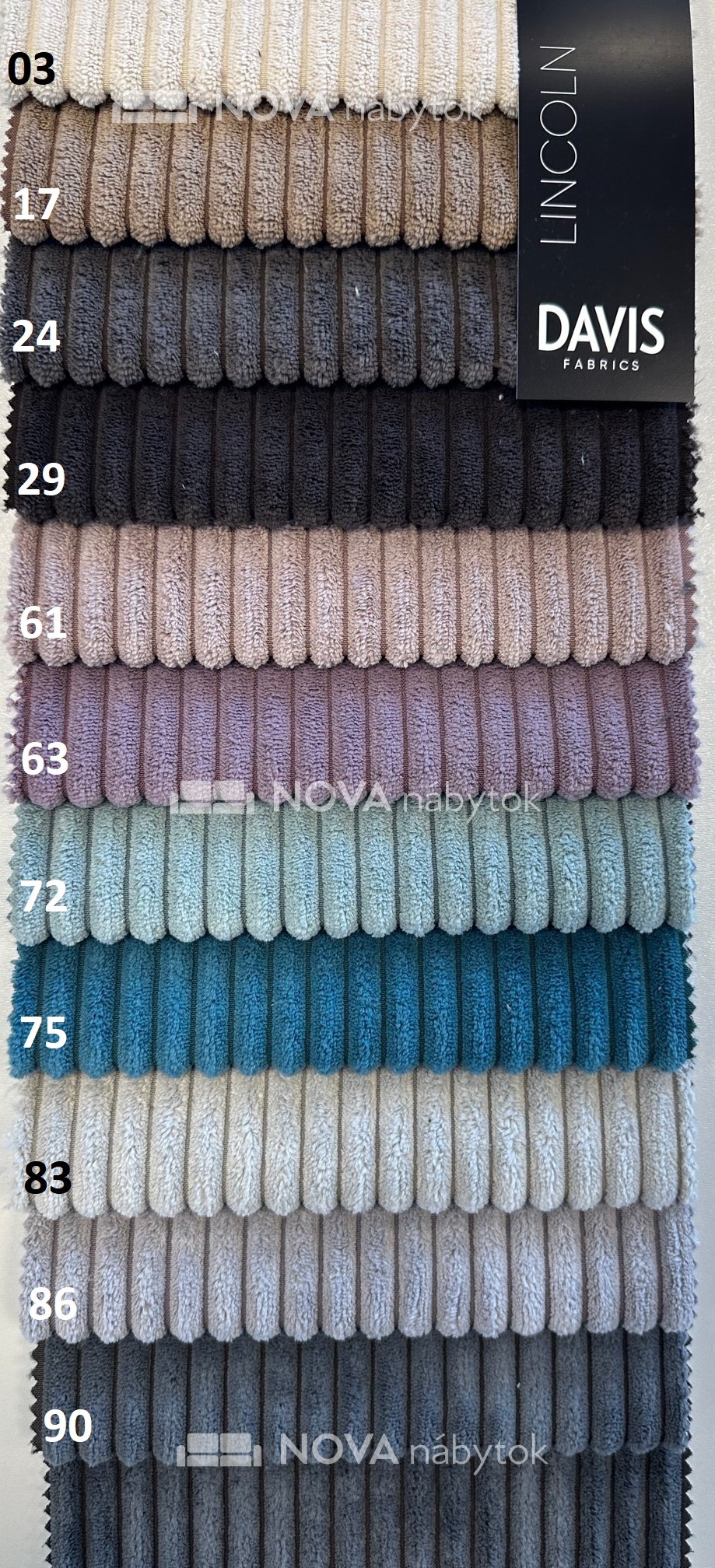 Farebný vzorkovník LINCOLN ponúka široký výber moderných odtieňov: Neutrálne a zemité tóny (03 krémová, 17 béžová, 24 hnedá, 29 čierna, 83 svetlá béžová, 86 svetlosivá, 90 tmavosivá), trendové farby (61 púdrová, 63 fialová, 72 mentolová, 75 tyrkysová).