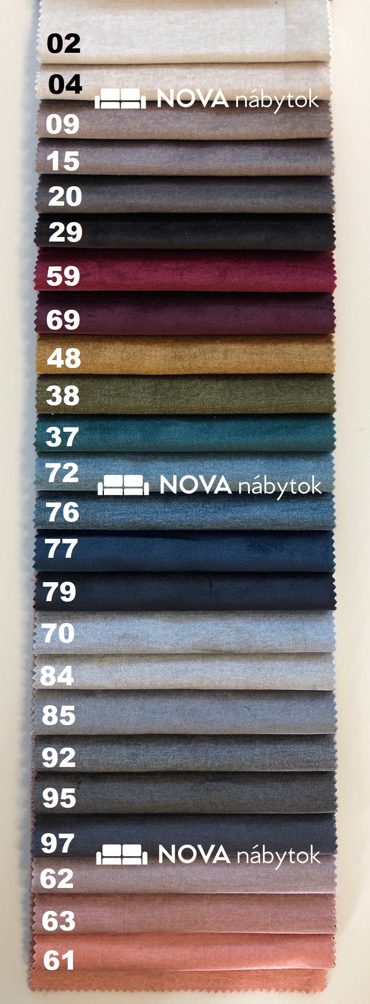 Vzorkovník MONOLITH ponúka široké spektrum farieb – od svetlých a neutrálnych tónov (MONOLITH 02 krémová, MONOLITH 04 béžová, MONOLITH 84 sivá), cez výrazné a elegantné odtiene (MONOLITH 59 bordová, MONOLITH 69 fialová, MONOLITH 37 tyrkysová), až po tmavé a sýte farby (MONOLITH 77 tmavomodrá, MONOLITH 92 grafitová, MONOLITH 97 antracitová).