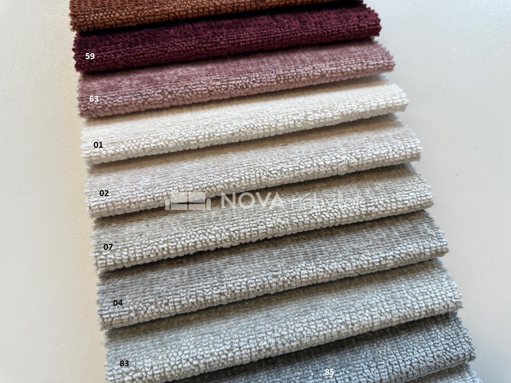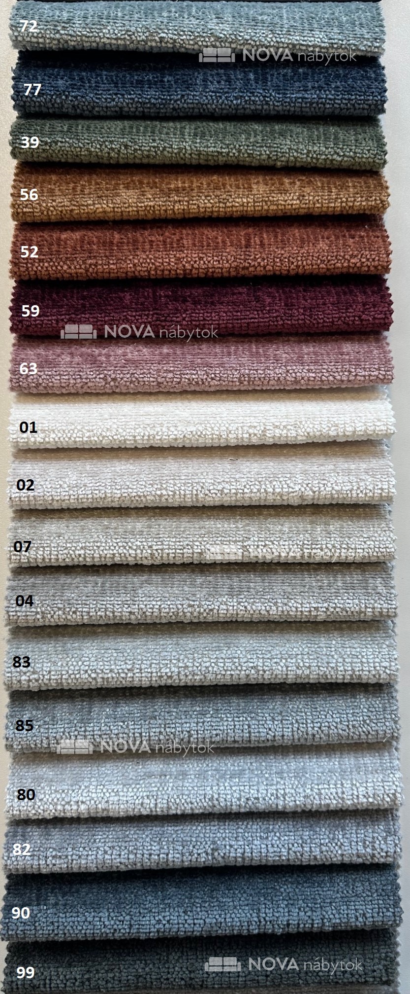 Vzorkovník PERFECT HARMONY prináša pestrú škálu odtieňov – od jemných svetlých tónov (PERFECT HARMONY 01 biela, PERFECT HARMONY 02 krémová, PERFECT HARMONY 07 béžová), cez moderné pastelové a prírodné farby (PERFECT HARMONY 39 zelená, PERFECT HARMONY 63 staroružová, PERFECT HARMONY 83 modrosivá), až po sýte a elegantné odtiene (PERFECT HARMONY 59 bordová, PERFECT HARMONY 77 tmavomodrá, PERFECT HARMONY 99 čierna).