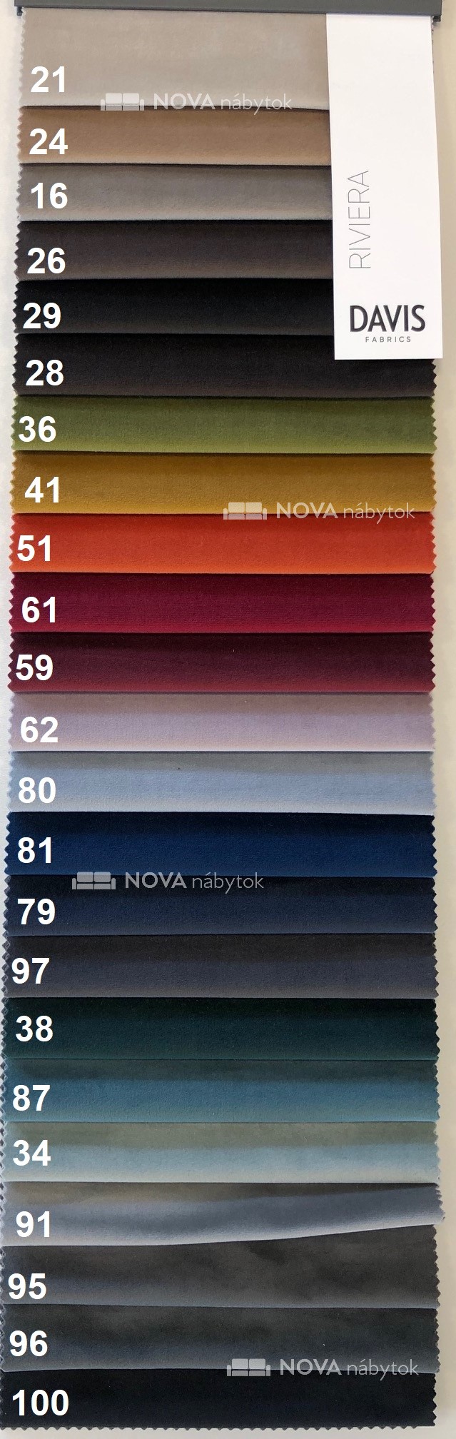 Poťahová látka RIVIERA patrí medzi najkvalitnejšie poťahové materiály s vysokou odolnosťou až 100 000 cyklov Martindale. Je veľmi príjemná na dotyk a zároveň pevná. Látka disponuje modernou povrchovou úpravou Aqua Clean, ktorá vytvára neviditeľnú molekulárnu vrstvu. Tá zabraňuje prenikaniu nečistôt do vlákien a umožňuje ich jednoduché čistenie iba pomocou vody. Vďaka svojim vlastnostiam je Riviera ideálna na sedacie súpravy, pohovky, kreslá a postele.