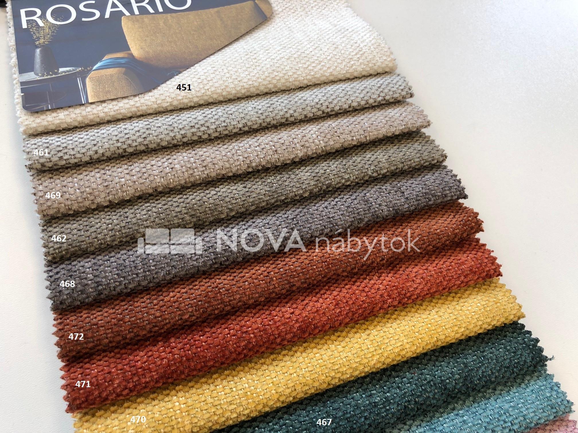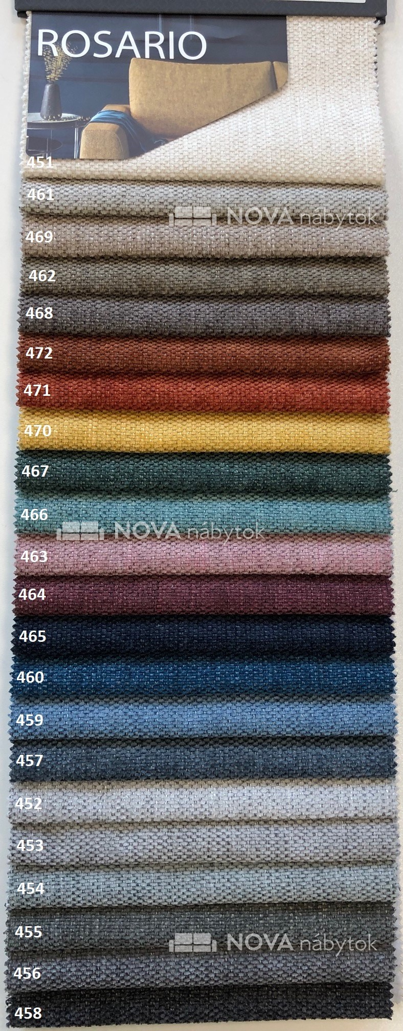 Farebný vzorkovník ROSARIO zahŕňa bohatú paletu odtieňov: Neutrálne a svetlé tóny (451 béžová, 461 svetlobéžová, 469 svetlosivá, 462 sivohnedá), tmavšie odtiene (468 sivá, 472 hnedosivá), živé farby (471 tehlová, 470 horčicová, 467 tyrkysová, 466 modrozelená, 463 ružová, 464 bordová, 465 tmavomodrá, 460 petrolejová, 459 bledomodrá, 457 oceľovomodrá), odtiene sivej a antracitu (452 svetlosivá, 453 sivá, 454 popolavá sivá, 455 tmavosivá, 456 grafitová, 458 antracit).