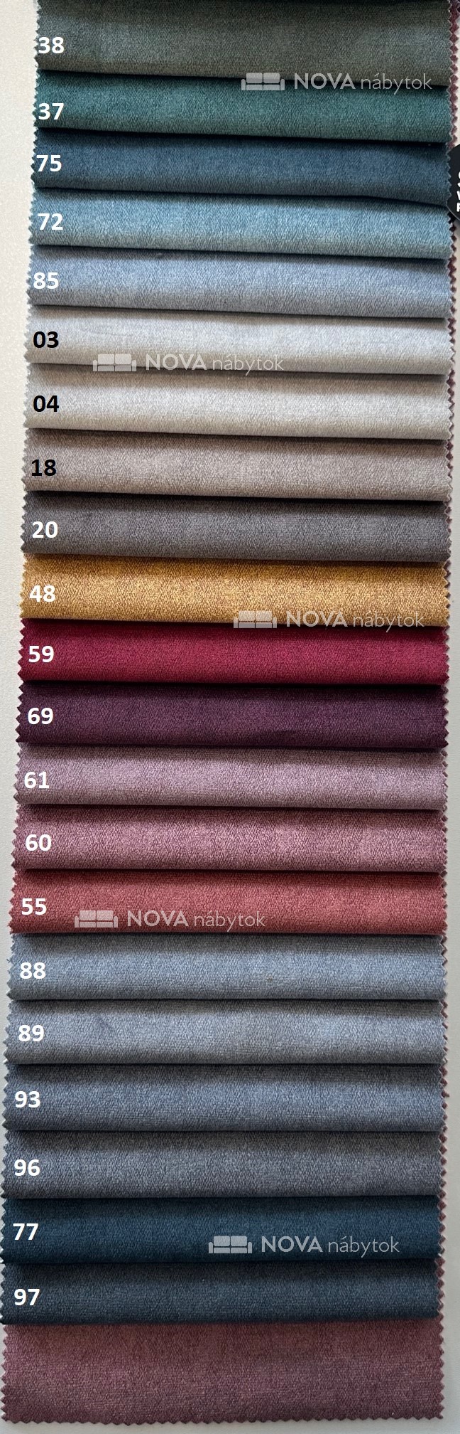 Farebný vzorkovník SEAL ponúka širokú škálu odtieňov – od jemných svetlých tónov (03 smotanová, 04 biela, 18 svetlosivá, 85 strieborná) cez moderné sivé variácie (20 tmavosivá, 88 oceľová sivá, 89 bridlicová sivá, 93 grafitová, 96 antracit) až po výrazné akcenty (48 horčicová, 55 tehlovočervená, 59 vínová, 69 purpurová, 60 ružovosivá, 61 staroružová). Kolekciu dopĺňajú atraktívne modré a zelené odtiene (37 zelenomodrá, 38 lesná zelená, 72 tyrkysová, 75 denimová, 77 námornícka modrá), ako aj moderný tmavý akcent 97 čierna.