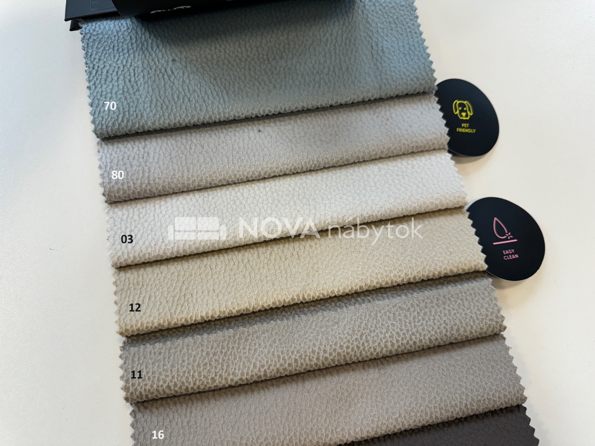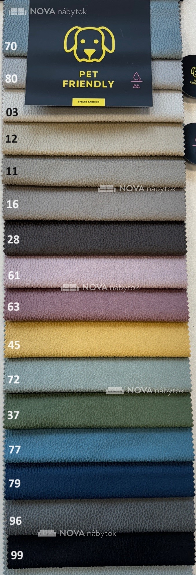 Poťahová látka SOLAR je veľmi príjemná na dotyk a má jemnú, mierne nápadnú textúru. Vďaka odolnosti 74 000 cyklov Martindale a technológii PET Friendly je ideálna na sedacie súpravy, pohovky, kreslá či postele. Vhodná aj do domácností so zvieratami.
