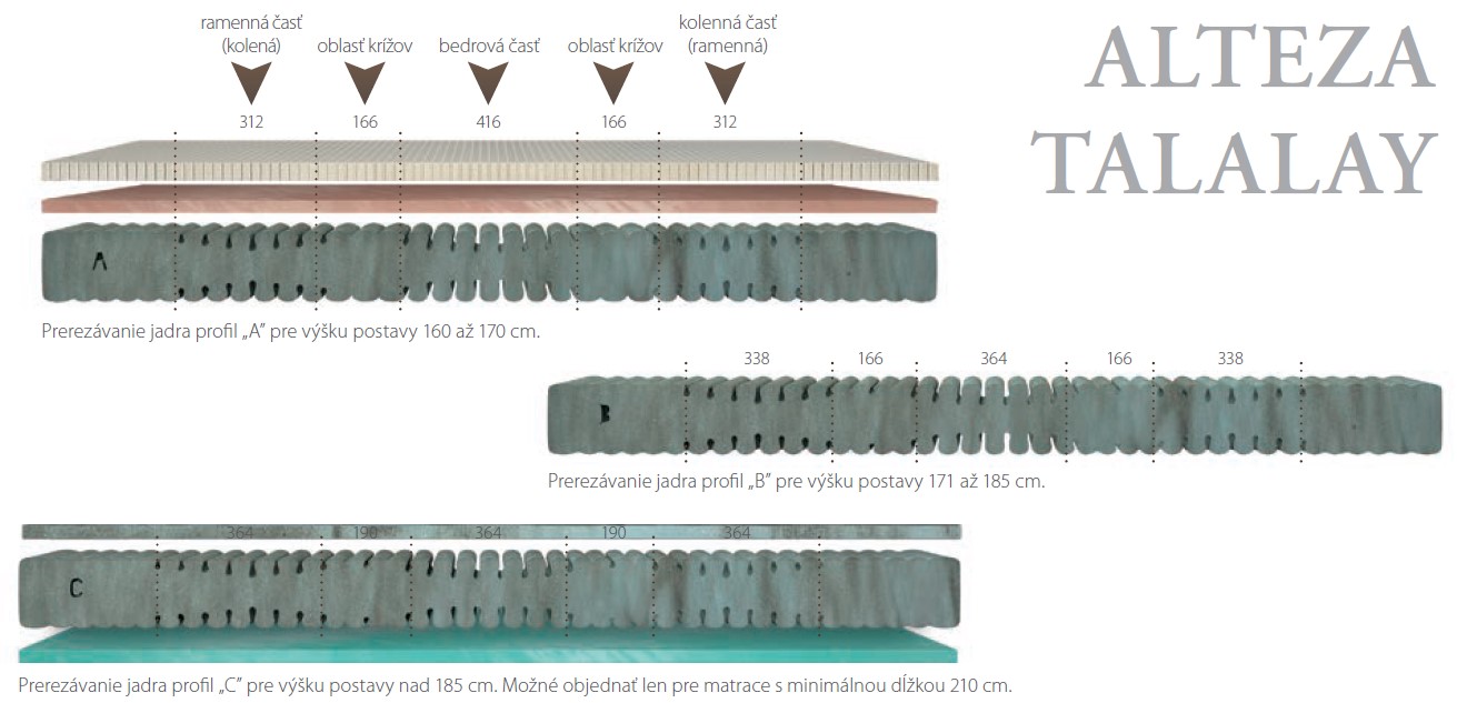 Matrac ALTEZA TALALAY bol vytvorený s cieľom zabezpečenia správneho zónovania jadra v pomere k individuálnej výške užívateľa. Vďaka trom verziám zónovania matrac umožňuje ideálnu podporu tela v anatomicky správnej polohe. Z tohto dôvodu treba pri výbere matraca zohľadniť výšku užívateľa. V ponuke máme tri verzie: A, B a C, pričom verziu profi lu „C” je možné objednať len u matracov s minimálnou dĺžkou 210 cm. Matrac je okrem základného materiálu v jadre, ktorým je certifi kovaná studená pena CELLFLEX, doplnený na povrchu jednej strany o ďalší výnimočný materiál TALALAY LATEX – jediný latex s otvorenou bunkovou štruktúrou. Talalay latex je bodovo prispôsobivý a dlhodobo elastický. Jeho elasticita, ktorá si vás získa dnes, bude nezmenená aj po dlhých rokoch užívania. Ďalšou použitou penou na prírodnom základe je výnimočný BIOGREEN, u ktorého je jeho základná výrobná zložka nahradená prírodným ricínovým olejom. Zabezpečuje pozvoľný prechod od jemného, elastického a bodovo kopírovacieho latexu do pevnejšieho jadra, potrebného pre ideálnu oporu chrbtice počas spánku. Matrac ALTEZA Talalay sa vyrába v dvoch verziách tuhosti H2 a H3 . Zároveň i jadro matraca má dve tuhosti povrchu, pričom strana s latexom pôsobí mäkšie.