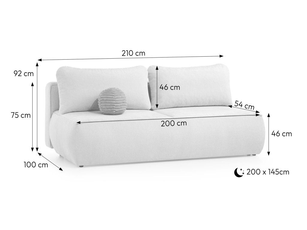 Veľkou výhodou je aj úložný priestor pod sedadlom, ktorý ponúka miesto na odloženie diek, vankúšov alebo lôžkovín. Mäkké chrbtové vankúše zvyšujú komfort pri sedení a spolu s priestranným sedadlom vytvárajú príjemné miesto na každodenný oddych. Výška sedu 46 cm a hĺbka sedu 54 cm podporujú pohodlné vstávanie aj sedenie.