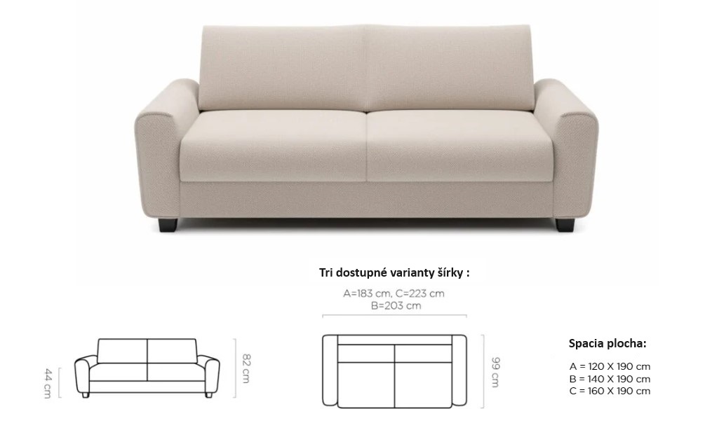 Rozmer: 203 x 99 cm, Spacia plocha: 140 x 190 cm, Výška: 82 cm, Výška sedu: 44 cm
