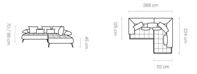Rozmer: 268 x 224 cm, Výška: 70 / 88 cm, Výška sedu: 45 cm, Spacia plocha po vysunutí: 118 x 202 cm