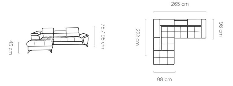 Rozmer: 265 x 222 cm, Výška: 75 / 95 cm, Výška sedu: 45 cm, Spacia plocha: 122 x 192 cm