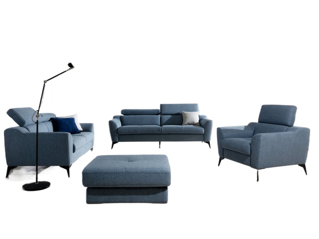 Za pohodlné stredne mäkké sedenie môže výplň sedacej časti, ktorú tvoria vlnovcové pružiny Falista a PUR pena. Trojsed aj dvojsed je pevný, bez možnosti rozloženia a bez úložného priestoru, zato ako bonus sú tu polohovacie opierky hlavy. Aj opierka hlavy na kresle je nastaviteľná, čo zvyšuje komfort sediaceho.