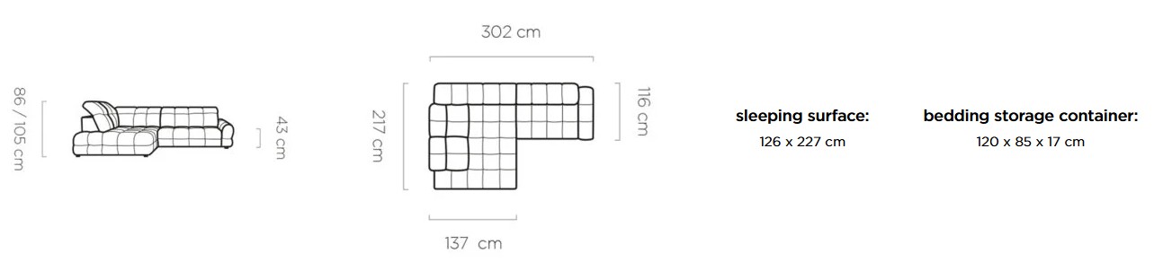 Rozmer: 302 x 217 cm, Výška: 86 / 105 cm, Výška sedu: 43 cm, Spacia plocha: 126 x 227 cm, Hĺbka sedu: 66 cm
