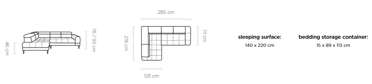 Rozmer: 285 x 218 cm, Výška: 76 / 93 cm, Výška sedu: 46 cm, Spacia plocha: 140 x 220 cm
