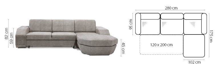 Rozmer: 280 x 175 cm, Spacia plocha: 120 x 200 cm, Výška sedu: 45 cm, Celková výška: 82 cm
