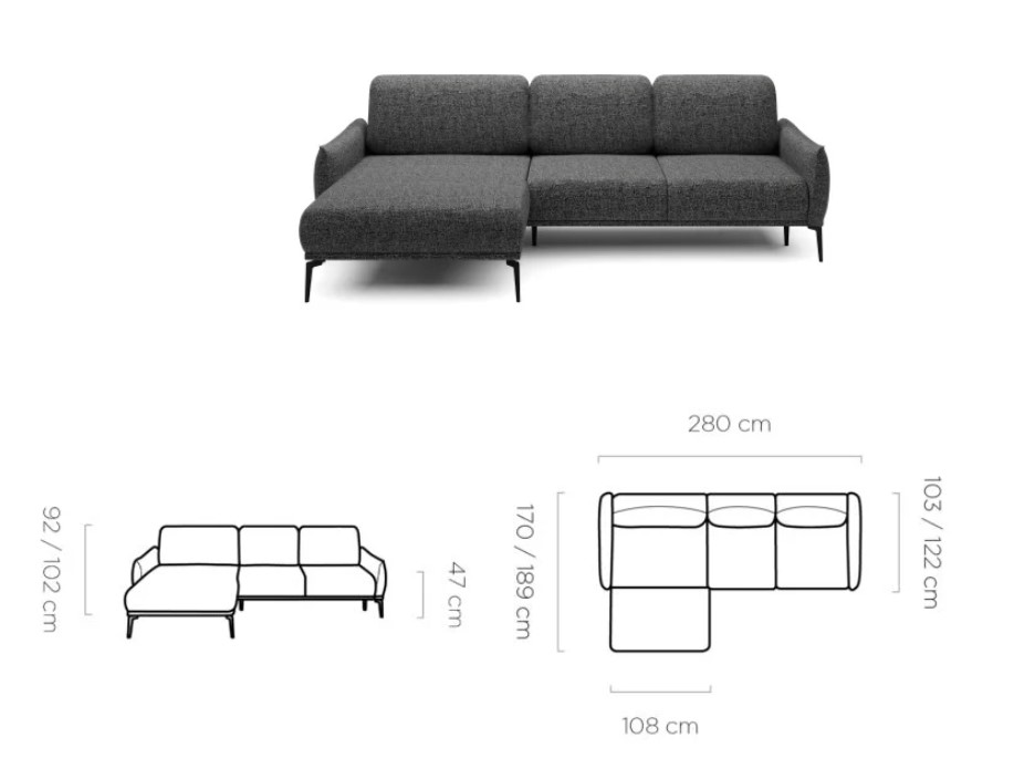 Rozmer: 280 x 170/189 cm, Výška: 92/102 cm, Výška sedu: 47 cm