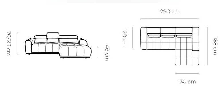 Rozmer: 290 x 188 cm, Výška: 76 / 98 cm, Výška sedu: 46 cm