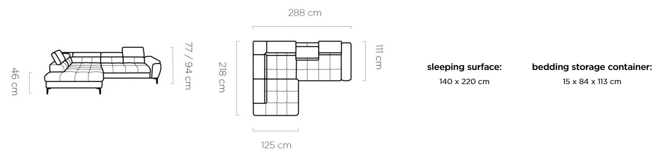 Rozmer: 288 x 218 cm, Výška: 77 / 94 cm, Výška sedu: 46 cm, Spacia plocha: 140 x 220 cm