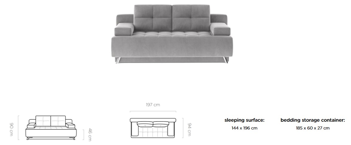 Rozmer: 197 x 94 cm, Spacia plocha: 144 x 196 cm, Výška: 90 cm, Výška sedu: 46 cm