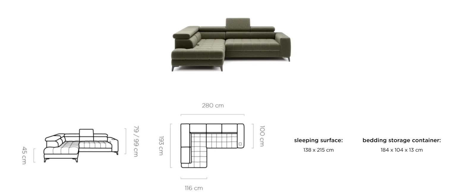 Rozmer: 280 x 193 cm, Výška: 79 / 99 cm, Výška sedu: 45 cm, Spacia plocha: 138 x 215 cm
