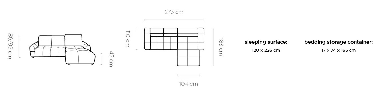 Rozmer: 283 x 183 cm, Výška: 86 / 99 cm, Výška sedu: 45 cm, Spacia plocha: 120 x 226 cm