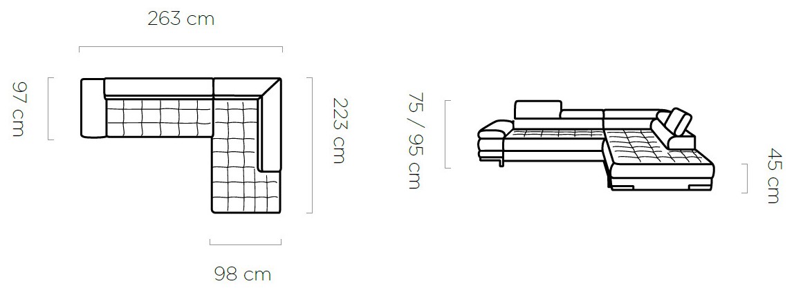 Rozmer: 263 x 223 cm, Spacia plocha: 190 x 122 cm, Výška: 75 / 95 cm, Výška sedu: 45 cm