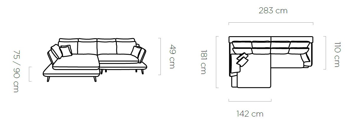 Rozmer: 283 x 181 cm, Spacia plocha: 136 x 235 cm, Výška: 75 / 90 cm, Výška sedu: 49 cm