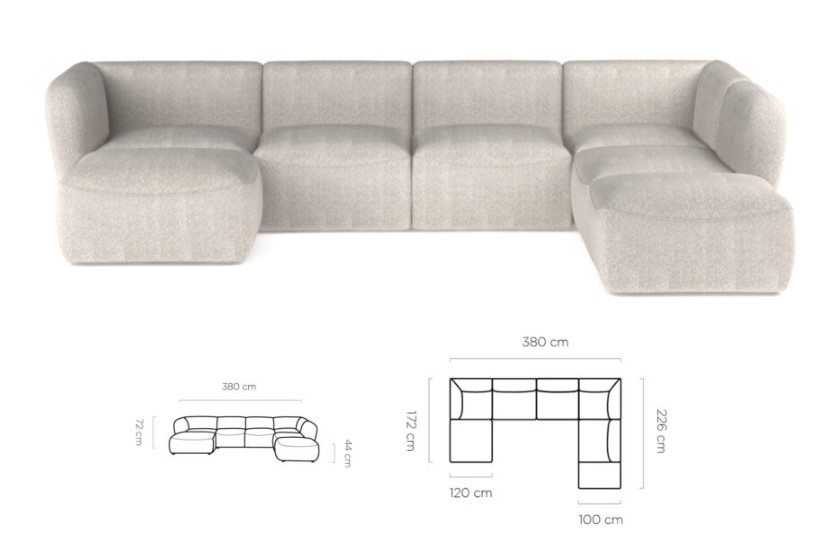 Rozmer: 172 x 380 x 226 cm, Výška: 72 cm, Výška sedu: 44 cm