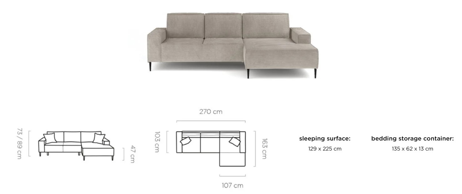 Rozmer: 270 x 163 cm, Spacia plocha: 129 x 225 cm, Výška: 73 / 89 cm, Výška sedu: 47 cm